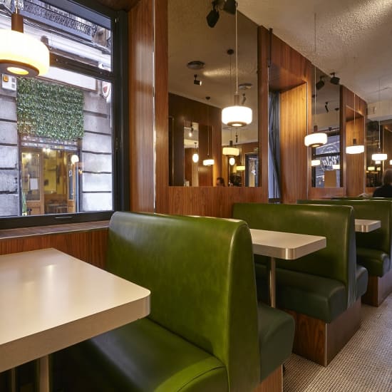 🎁 ¡Regala esta experiencia a tus seres queridos! Haz clic aquí para ver nuestra tarjeta de regalo. Qué vas a disfrutar 🍽️ Un delicioso brunch para disfrutar del fin de semana ✨ Una gran variedad de platos dulces y salados 👉 En pleno barrio de Malasaña Información 📅 Fecha: Selecciona la fecha que quieras directamente en el calendario 📍 Lugar: Home Burger Bar Silva, Madrid 📞 Después de comprar tu entrada, es imprescindible confirmar tu reserva con el local (encontrarás los pasos a seguir en tu email de confirmación) Menú Basic en Home Burger Empezamos con : Café o infusión Zumo de naranja natural, cerveza de barril E.Damm o refresco Yogur griego con granola y miel o frutas del bosque Mini porción de brownie, carrot cake o croissant plancha Plato principal, a elegir entre : Bagel: Bagel con queso crema, aguacate y salmón ahumado acompañado de ensalada mézclum con tomate. Tortitas: pancakes con frutas del bosque, nata montada y sirope de chocolate. Menú Especial en Home Burger Empezamos con : Café o infusión Zumo de naranja natural, cerveza de barril E.Damm o refresco Yogurt griego con granola y miel o frutas del bosque Mini porción de brownie, carrot cake o croissant plancha Plato principal, a elegir entre : Benedict: Mollete con guacamole, pico de gallo, huevos a la plancha con salsa holandesa y bacon o salmón. Descripción Ven a Home Burger, un diner con estética años 80 en pleno Malasaña donde podrás elegir diferentes opciones para confeccionar tu brunch. ¿Te vienes a darte un homenaje? ¡Disfruta de tu menú brunch en Home Burger, Madrid!
