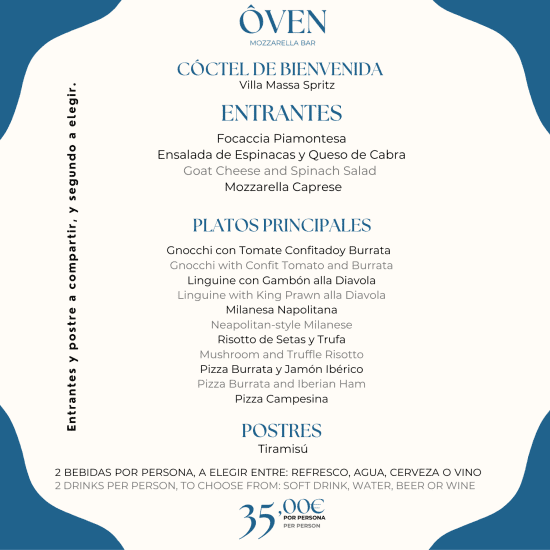 ⭐ La Notte Sotto le Stelle 🕯️ Una velada especial donde la gastronomía italiana se encuentra con la música en directo, bajo la luz de las velas, en pleno corazón de Madrid. Tras el éxito de las últimas ediciones, volvemos en enero con una experiencia pensada para disfrutar sin prisas, con buena comida, buen vino y música en vivo. ✨ Qué vas a disfrutar 🍝 Cena italiana con una selección especial de platos de la carta de ÔVEN , inspirados en la auténtica tradición italiana del chef Fabio Morisi. 🎶 Música en directo con estilo italiano , en dos formatos únicos: 🎹 Piano en directo Jueves 8 y 22 · César Ausejo 🎷 Saxofón en directo Jueves 15 y 29 · Álex Sánchez 🕯️ Ambiente romántico , iluminado por velas, ideal para compartir en pareja o con amigos. ℹ️ Información 📅 Jueves noches de enero 🗓️ 8, 15, 22 y 29 🕒 Horario: desde las 20:00 📍 Lugar: ÔVEN Fuencarral 74 · Madrid 🍽️ Menú · La Notte Sotto le Stelle: 🍋 Cóctel de Bienvenida Villa Massa Spritz 🫒 Entrantes (a compartir cada 2 personas) Focaccia Piamontesa Ensalada de Espinacas y Queso de Cabra Mozzarella Caprese 🍝 Platos principales (a elegir) Gnocchi con Tomate Confitado y Burrata Linguine con Gambón alla Diavola Milanesa Napolitana Risotto de Setas y Trufa Pizza de Burrata y Jamón Ibérico Pizza Campesina 🍰 Postre (a compartir cada 2 personas) Tiramisú Café / Infusión Precio : 35,00€ por persona (2 bebidas por persona: agua, refrescos, cerveza o vino)