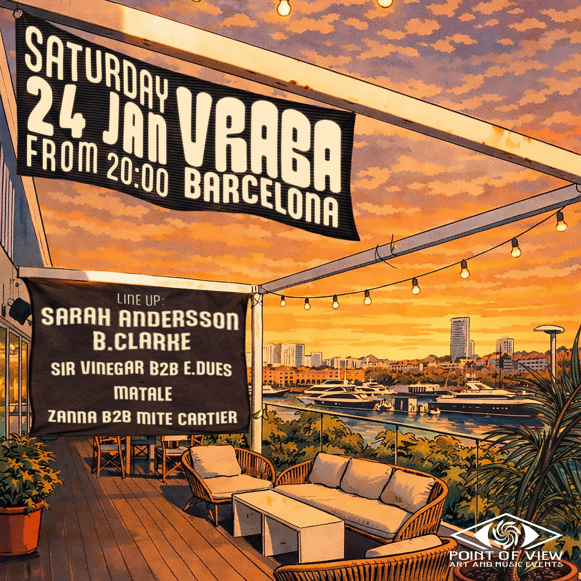 Point Of View returns to Vraba in BARCELONA 🌊 📅 Saturday 24 JANUARY ⏰ 20:00 – 03:00 📍 Vraba Restaurant — Ciutat Vella, Barcelona 🎟️ Tickets: Link in Bio Dinner meets dancefloor in a waterfront hideout. 🍔 Start with a proper burger and cocktails, then let the terrace turn into a late-night groove spot overlooking the marina — salty air, city lights, and that “one more track” energy. ⚓ 🎧 LINE UP 🔹 Sarah Andersson — (@sarahanderssondj) 🔹 B.Clarke — (@b.clarke) 🔹 Sir Vinegar b2b E.DUE.S — (@sir_vinegar_ / @eduardseno) 🔹 Matale — (@matale) 🔹 Zanna b2b Mite Cartier — (@zannaneio / @alex.riz.yeux) ⚡ SARAH ANDERSSON Swedish-Brazilian DJ & producer, W Barcelona resident — percussive house/tech/minimal with rolling basslines and peak-time lift. 🔥 ✨ B.CLARKE Chilean, Berlin-based — glitter-bright energy, house across decades (deep, classics, disco) with Latin pulse. 🌈 🚀 SIR VINEGAR b2b E.DUE.S A Point Of View Milan connection — seamless, dynamic B2B blending house, minimal techno, deep house and disco. ⚡ 🌲 MATALE Deep emotional grooves and warm house textures — hypnotic, fluid, and uplifting. 🍃 🌀 ZANNA b2b MITE CARTIER Milan x France, now Barcelona — warm-up builders with modern tech-house and pure house passion. 🪩 🌀 NEVER LOSE YOUR POINT OF VIEW 🌀 Venue: Vraba Restaurant Address: Moll d'Espanya, s/n, Ciutat Vella, 08039 Barcelona, Spain Music Genres: Deep House, House, Tech house Presented by: Point Of View